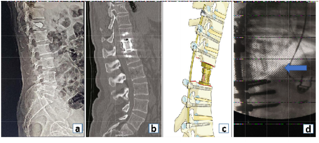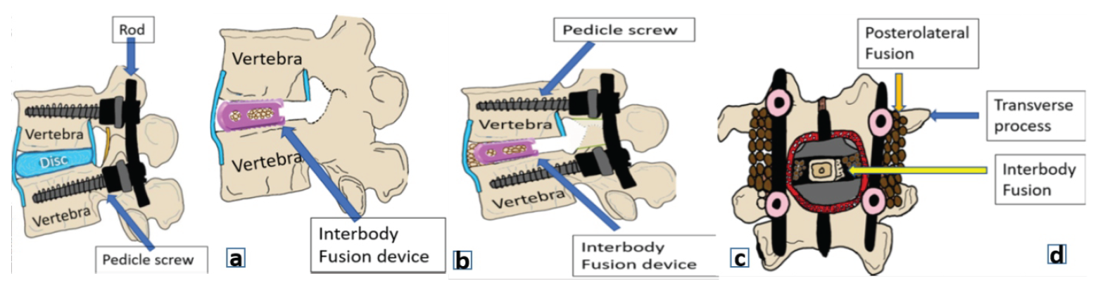 Figure 1: (a) Posterior spinal fixation, (b) Spinal Fusion (interbody), (c) Spinal fixation with fusion, (d) Anteroposterior image demonstrating interbody fusion between the vertebral bodies and posterolateral fusion across the transverse processes.