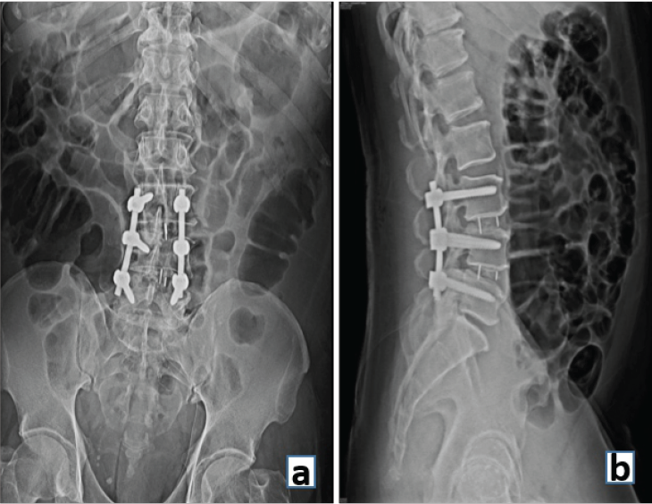 Figure 10: (a) Anteroposterior and (b) Lateral radiograph demonstrating interbody fusion at L3-4 and L4-5 levels and stabilization with posterior pedicle screws and rods.