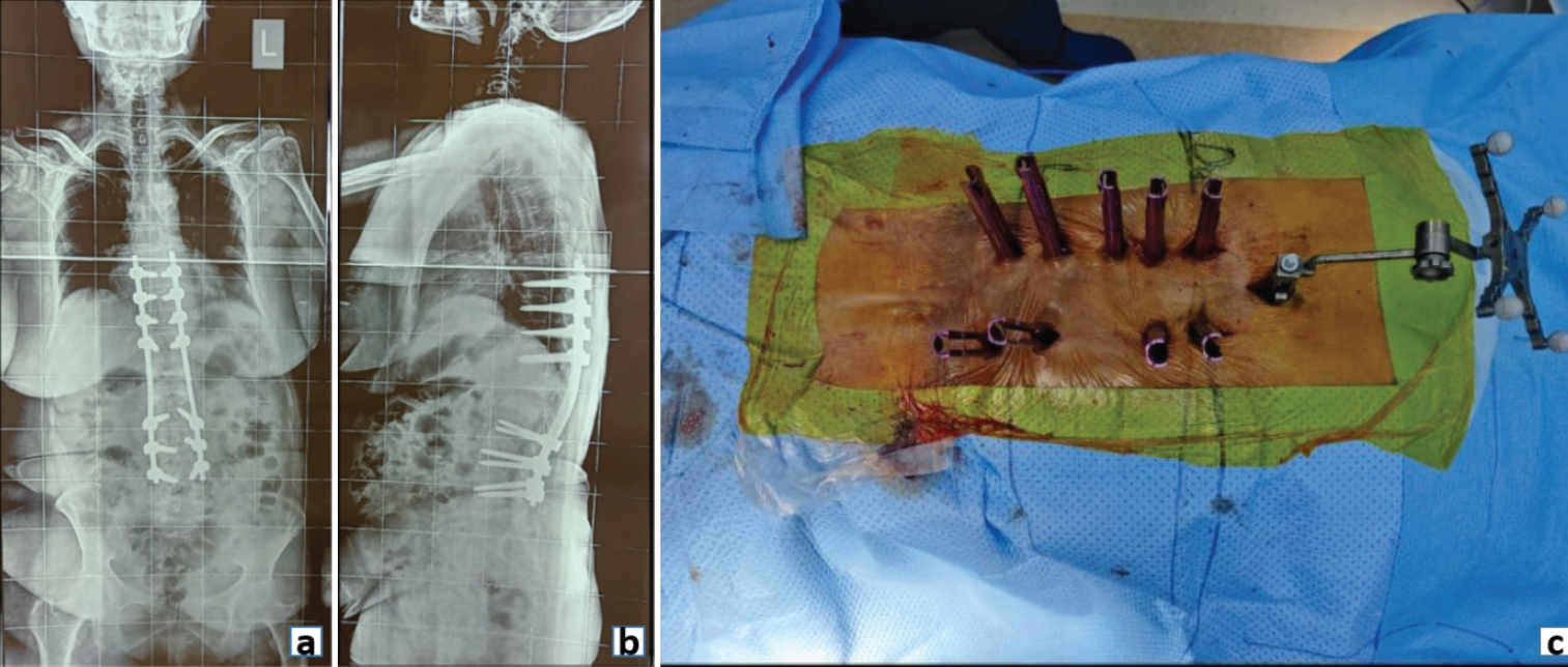Figure 2: Post-operative radiograph (a) Anteroposterior and (b) Lateral view showing posterior pedicle screw fixation in an osteoporotic fracture spine. (c) Clinical image demonstrating minimally invasive screw fixation in an osteoporotic spine.