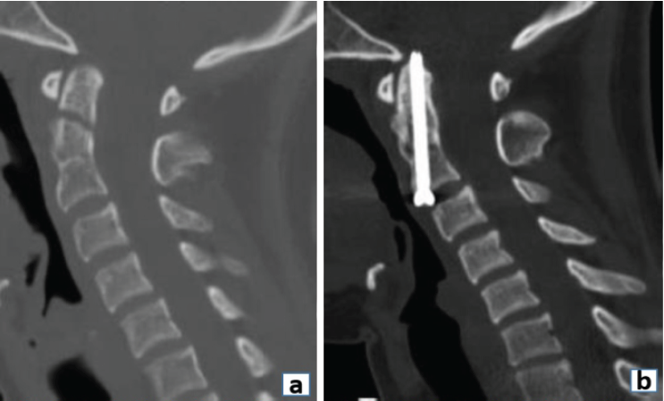 Figure 3: (a) Pre-operative Sagittal computed tomography (CT) image demonstrating a type II Odontoid fracture. (b) 6-month post-operative sagittal CT scan image demonstrating fixation with anterior odontoid screw.