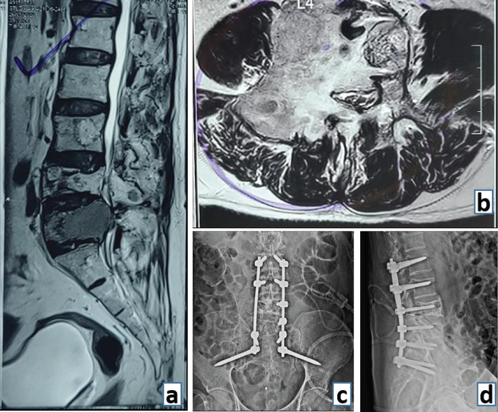 Figure 4: (a) Preoperative sagittal magnetic resonance imaging (MRI) film demonstrating an expansile lytic lesion of multiple myeloma at L4 vertebral level (sacralised L5). (b) Preoperative axial MRI image showing the extent of vertebral body involvement and the posterior elements at L4 level. (c) Post-operative anterior and (d) lateral radiograph demonstrating lumbopelvic stabilization of the spinal column in a case of multiple myeloma.