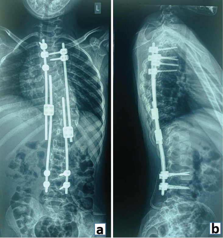 Figure 5: (a) Anteroposterior and (b) Lateral radiograph demonstrating stabilization with pedicle screws and growth rods in a case of early onset scoliosis.