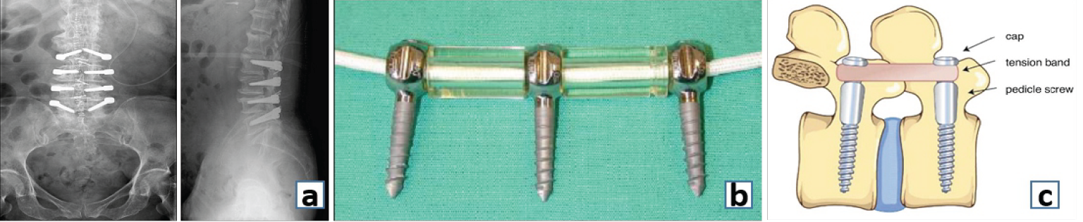 It involved the placement of pedicle screws, followed by connecting them with polyester bands instead of rods. Concerns with this device include overtightening of the polyester bands, leading to radicular symptoms (Fig. 6) [8].