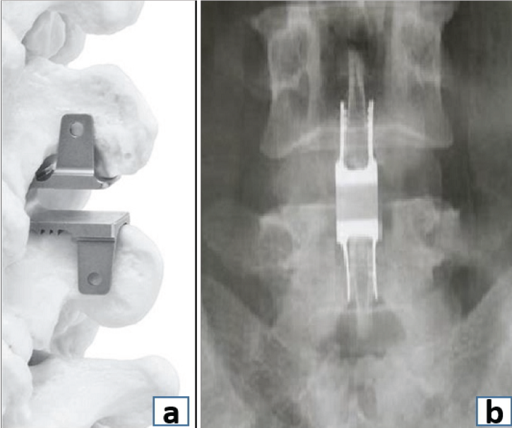 Figure 7: (a) Placement of interspinous spacer device. (b) Anteroposterior radiograph showing the interspinous spacer device.