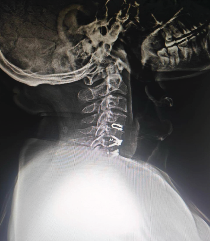 Figure 8: Lateral cervical spine radiograph demonstrating a dynamic cervical implant at C4-5 level (blue arrow) above the two level anterior cervical discectomy and fusion done at C5-6 and C6-7 levels.