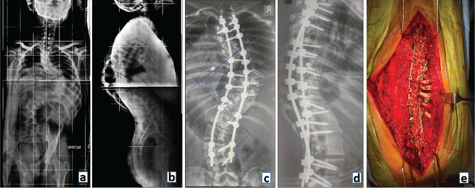 Figure 9: Preoperative radiograph (a) anteroposterior and (b) lateral view showing a Double Major Curve Lenke type 3 adolescent idiopathic scoliosis. Postoperative (c) Anteroposterior and (d) Lateral radiograph showing deformity correction with fusion and posterior stabilization with (e) clinical image demonstrating bone graft laid across the fusion bed prepared by decorticating laminae and removing spinous processes.