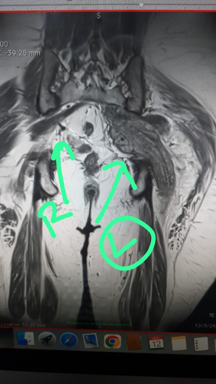 Glomus tumors typically occur in the digits, palm, or nail beds but rarely involve deep structures, such as peripheral nerves [1,7]. Sciatic nerve glomus tumors are extremely uncommon and can mimic sciatica, piriformis syndrome, or lumbar radiculopathy, which are common presentations in the middle-aged group. We could find only 3 reported cases till date [3,4,8]. Clinical examination remains a cornerstone in diagnosing nerve tumors, guiding further investigations and treatment decisions. A thorough assessment helps differentiate between neuropathic and musculoskeletal causes of symptoms, ensuring timely intervention. Key findings, such as localized tenderness, Tinel’s sign, and motor deficits, provide crucial clues for accurate diagnosis and surgical planning. The patient even underwent an endoscopic discectomy, which was not required. Diagnosis is usually delayed in such cases [9]. In our case, the diagnosis was reached at 3 years. MRI is essential for diagnosis, but glomus tumors may be mistaken for schwannomas or neurofibromas. [10] Any surgical intervention is challenging to explore the proximal sciatic nerve and sacral plexus. Both anterior and posterior approaches are described for intra-pelvic exploration of the sciatic nerve, but we selected ant pararectus approach. Presence of the large tumor in the region of L5 and S1 is also likely to compress iliac artery and vein, and we found the same in our case, where the common iliac vein was completely flattened and adherent to the tumor, and it was not possible to dissect it. The chances of Venus complications after the operation are likely. DVT of the proximal femoral vein occurred in our case post-operatively. Surgery of the tumor in this part needs a multidisciplinary team and, in this case, along with an orthopedic surgeon, a plastic surgeon having experience of nerve tumors, and an oncosurgeon having experience of pelvic tumors, where part of our surgical team. Complete surgical excision in a sciatic nerve tumor is not possible, so limited decompression/excision should be undertaken by an experienced surgeon. Histopathology and immunochemistry are very helpful for the accurate diagnosis of a glomus tumor. To our knowledge, this is the first case of a glomus tumor of the most proximal part of the sciatic nerve and so there is no comparison for management and prognosis of this tumor.
