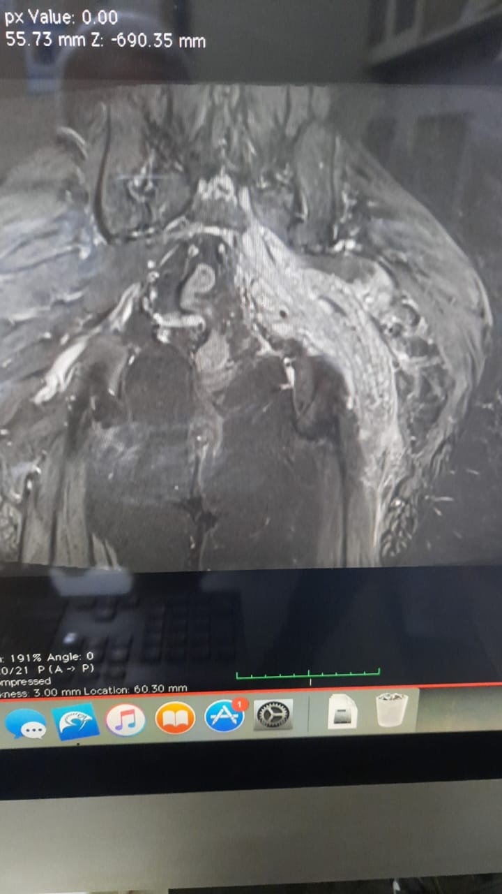MRI – Hyperintense lesion in the sciatic nerve along the L4, L5, and S1 fibers, starting in the retroperitoneum and extending beyond the greater sciatic foramen. Approximate length was 20 cm (Figs. 1 and 2).