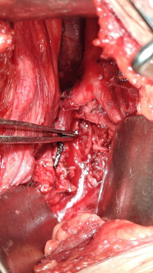 Figure 4: Showing sciatic nerve, behind the bifurcation of common iliac artery, through pararectus approach.
