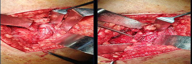Figure 5: Showing the sciatic nerve through the Kocher-Langenback approach, the first image shows the sciatic nerve after dissection, and the second after longitudinal incision over the nerve.