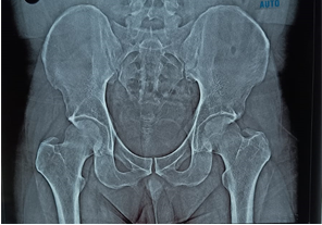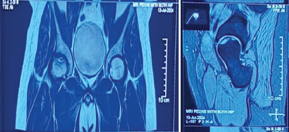 A 32-years-old male patient presented after a fall from height in January 2024, and sustained a flank injury and a left distal radius comminuted fracture. He had diffuse pain at the groin and hip; however, subsequently, after a month, pain localized to the right hip, which gradually worsened, limiting his walking distance not more than a few hundred yards. He has no fever episodes or systemic constitutional symptoms. On clinical examination, he had an antalgic gait and a positive Trendelenburg test on the right side. There was no localized tenderness over the hip joint. The range of movements of the hip was preserved, but with pain during deep rotations. The right leg appeared relatively longer (apparent length). No signs of femoro-acetabular impingement. Harris Hip Score was 36, reflecting severe functional limitation.
