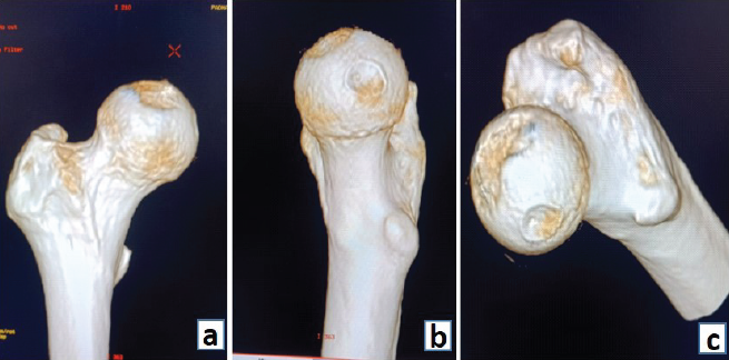 CT scan revealed a large osteochondral defect in the weight-bearing area of the femoral head, with the fragment displaced into the inferior joint space (Fig. 2a, b, c).