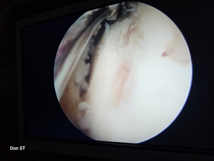 The procedure was performed under spinal anesthesia, in a supine position. Hip traction was applied. Antibiotic (Injection Cefuroxime 1.5 g) administered before skin incision. An anterolateral portal was established under C-arm guidance. Modified anterior portal established under direct vision. Diagnostic hip arthroscopy was performed, revealing a focal osteochondral defect of size 15 mm × 5 mm located over the weight-bearing superoanterior dome of the femoral head (Fig. 4). The acetabulum and labrum were normal.
