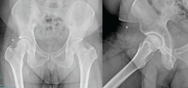 Figure 6: Anteroposterior and lateral radiographs of the right hip at 1-year follow-up.