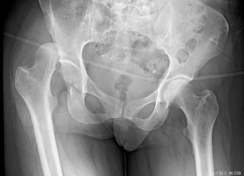 Figure 1: Anteroposterior view of pelvis with both hips showing posterior hip fracture dislocation on the right side.