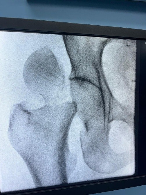 Figure 2: C-arm image of the right hip showing an iatrogenic femoral neck fracture after attempted closed reduction.