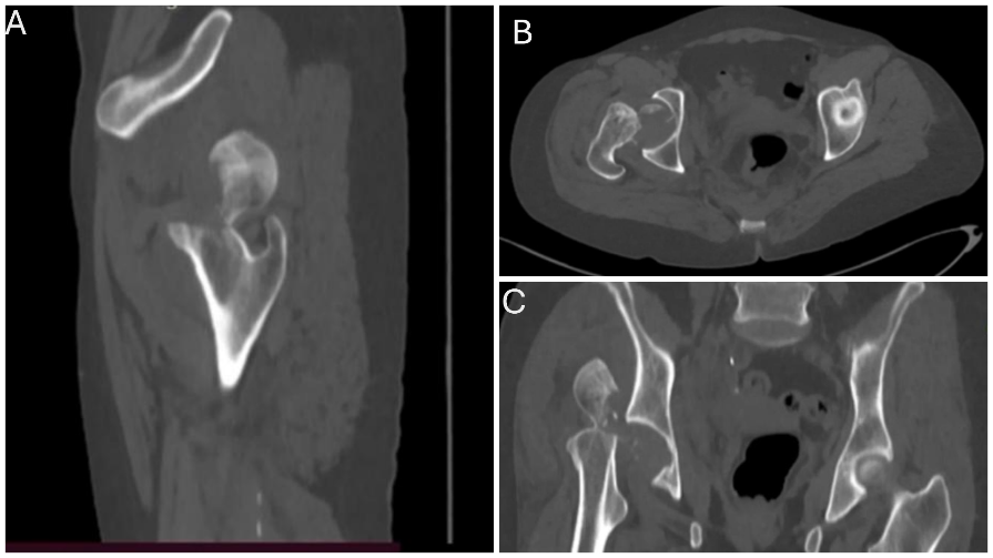 Figure 3: Computed tomography of the pelvis showing femoral neck fracture in sagittal (a) and coronal view (b) showing fractured femur head fragment, (c) and axial view .