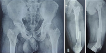None of the patients experienced post-operative knee or hip stiffness after undergoing combination fixation with an intramedullary nail and derotation plate. X-rays of the patient with follow-ups at 3 months and 6 months(Fig. 1, 2, 3, 4).