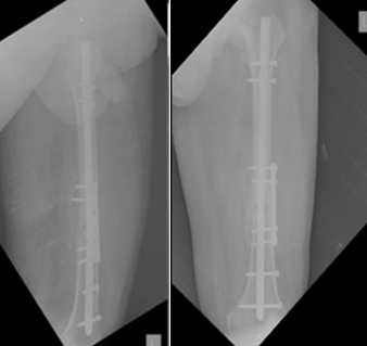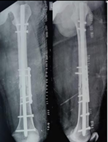 Discussion: By integrating femur nailing with plate augmentation, we can achieve the benefits of both methods for fixing fractures while minimizing their possible issues and downsides. The femur nail functions as a load-sharing device, counteracting the shear stresses at the fracture site and ensuring the consistent positioning of the fracture. Derotation plate fixation is used to manage excessive movement at the fracture site, ensuring stability and preventing any reduction loss.