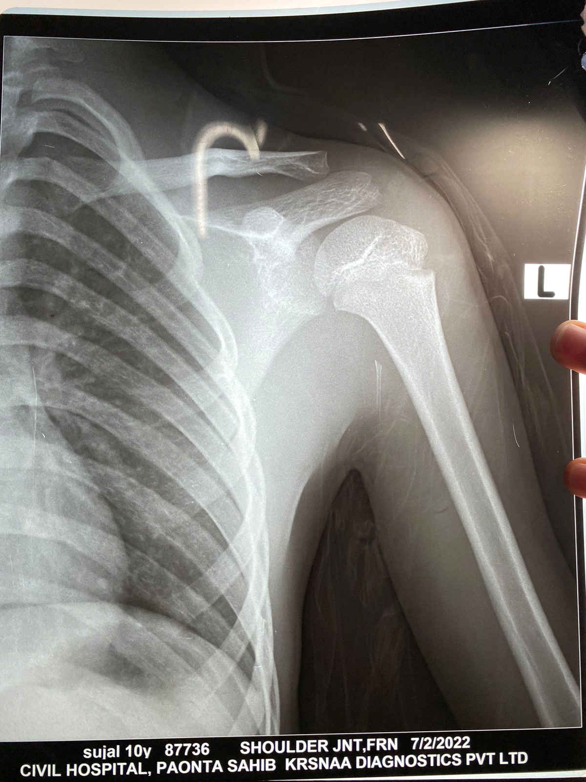 A 10-year-old male child presented to the emergency department with a history of pain and swelling in the left arm and left shoulder from 3 to 4 days. His mother gave a history of fall while playing 6 days back. He was afebrile with a blood pressure of 96/64 mm of Hg and Pulse rate 88/min. On examination, there was a nontender swelling in the left arm with decreased range of motion in the left shoulder joint. Distal pulses were normal, and there was not any neurological deficit. On the basis of history and examination, a clinical diagnosis of soft-tissue injury of shoulder or possibility of physeal injury of proximal humerus was made. He was advised rest, and shoulder immobilizer was applied, and oral analgesics were given. The patient was admitted and kept for observation. On Day 2 of admission, swelling was grossly increased with erythema and induration over whole of the left arm and shoulder (Fig. 1). X-ray image showed soft-tissue swelling of the left arm (Fig. 2). On palpation, the overlying skin was warm, and the patient had temperature of 100.1℉; however, vital signs were normal. WBC count was 11.24 × 103, Hb was 10 g/dL, and C-reactive protein reactive = 6.