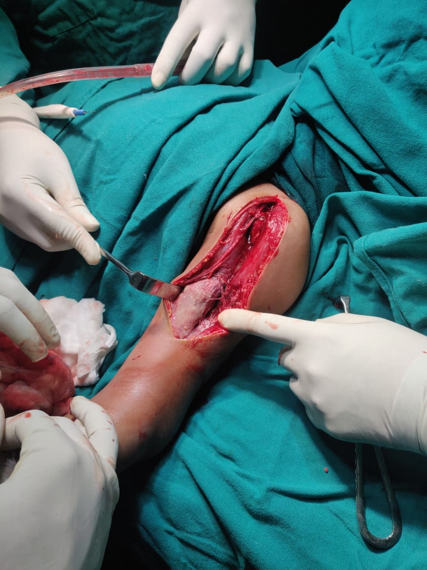 About 10 cc of frank pus aspirated from the left shoulder joint and sent for culture and sensitivity. Arthrotomy was performed along with incision and drainage of pus from the whole of the anterior compartment of the left arm, done by deltopectoral approach. About 35 cc of pus was drained from the left arm and shoulder joint. On Gram stain, diplococci were seen. Sensitivity could not be established due to low colony count. Intraoperatively, necrosis of biceps and brachialis muscles was found in the superficial planes (Fig. 3). Postoperatively, broad-spectrum IV antibiotics (Ampoxin and Clindamycin) were given to the patient. He responded very well as swelling and erythema decreased slowly, and the process of wound healing took place on subsequent dressings. Patient was on IV antibiotics for three weeks and oral antibiotics for 3 weeks. Now wound is completely healed, and the child is doing well with physiotherapy. Biopsy report showed necrosis with inflammatory changes suggestive of necrotising inflammation.