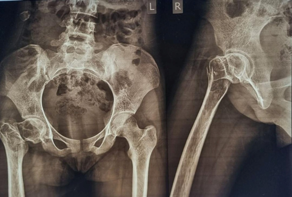 Figure 1: Giant cell tumor involving the neck region of the femur with pathological fracture.
