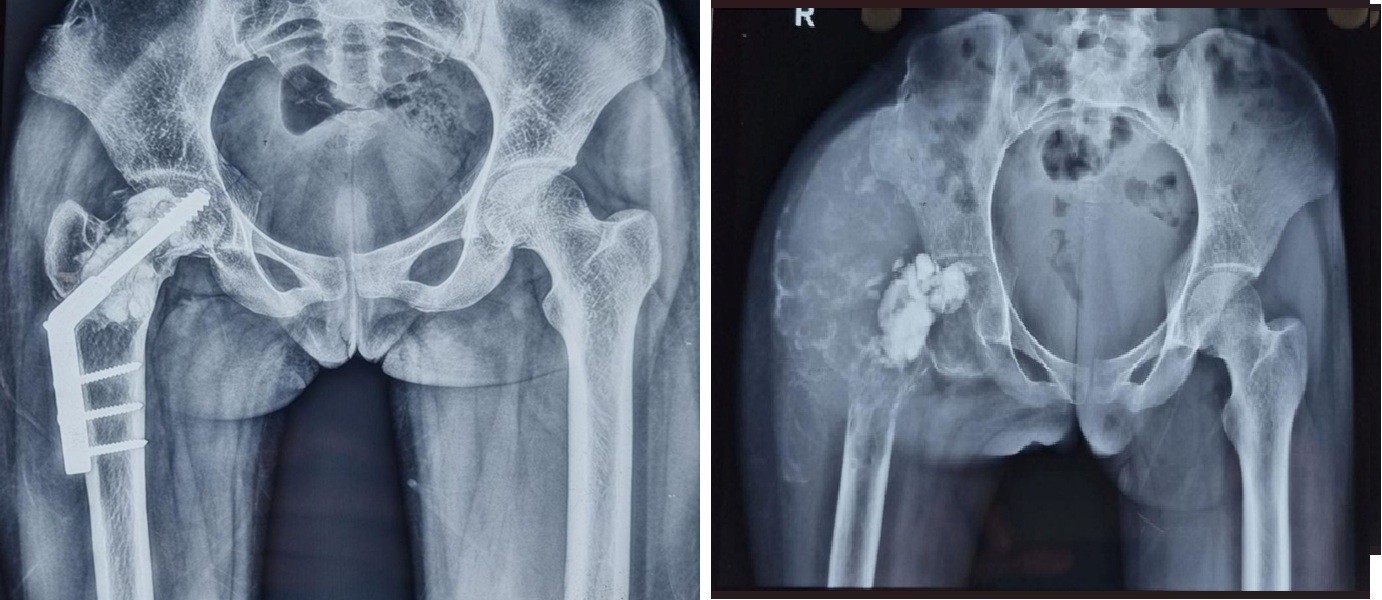 Figure 2: Initial treatment included curettage, cement filling, and dynamic hip screw fixation. Following tumor recurrence, the implant was removed.