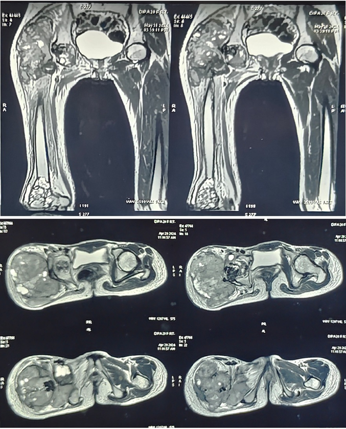 Two years after that, the patient presented to our institution. The primary symptoms included pain and swelling in the proximal femur, and the patient was ambulating with support due to her inability to bear full weight on the right leg. On examination, the proximal thigh exhibited a large, diffuse swelling with a 10 cm scar over the lateral aspect. The swelling was tender, had a variegated consistency and irregular borders, and was immobile and fixed to the underlying bone. The margins were ill-defined.