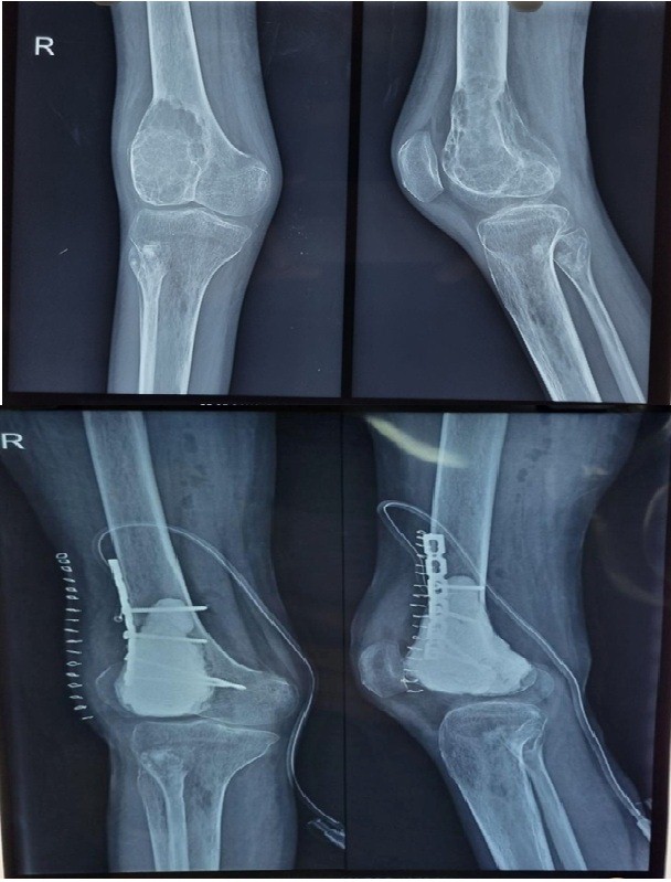 The distal femur exhibited an osteolytic lesion with a characteristic “soap-bubble” appearance. The patient was asymptomatic with regard to this lesion. Radiologically, the lesion showed epiphyseo-metaphyseal extension and was well-contained without any cortical breach. MRI findings also suggested a likely GCT. A core needle biopsy confirmed the diagnosis. Neoadjuvant denosumab, a RANKL inhibitor, was administered subcutaneously at a dose of 120 mg on days 1, 8, 15, and 28, followed by maintenance doses at 4-week intervals for a total of six doses. This pre-operative treatment regimen resulted in the formation of adequate surgical margins. Notably, denosumab therapy enabled surgical resection of the previously unresectable tumor.