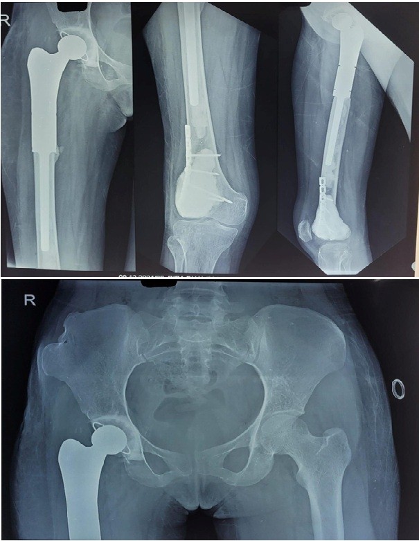 Conclusion: This case highlights an exceptionally rare presentation of recurrent GCT with a skip lesion in the same bone and asymptomatic pulmonary metastases. Early recognition, appropriate imaging, and a multidisciplinary approach – including denosumab therapy and surgical reconstruction – are essential for favorable outcomes in such aggressive and atypical cases.