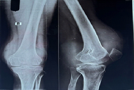 Figure 1: Pre-operative X-ray (anteroposterior and lateral) showing multiple calcified intra-articular loose bodies.