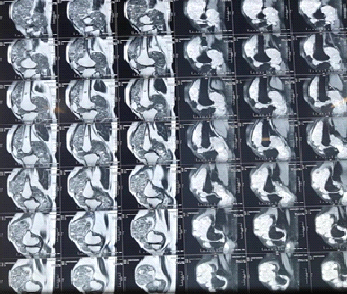 A 42-year-old male, employed as a bank clerk, presented to our orthopedic outpatient department with a chief complaint of gradually progressive pain and swelling in the posterior aspect of his left knee for the past 18 months. The pain was insidious in onset, initially mild and intermittent, but had progressively worsened in intensity over the past 6 months, becoming persistent and affecting daily activities. The patient reported that the pain increased during prolonged standing, walking, or ascending stairs, and was partially relieved by rest and over-the-counter nonsteroidal anti-inflammatory drugs (NSAIDs). He also noted a feeling of fullness and a palpable lump in the back of his knee for the past 4 months, which he described as firm and slowly enlarging. There was no history of trauma, recent infection, or previous knee surgery. His medical history was unremarkable, with no known metabolic, rheumatologic, or malignant conditions. He denied any constitutional symptoms such as fever, weight loss, or night sweats. On clinical examination, the patient was of average build and appeared in no acute distress. Inspection of the left knee revealed no gross deformity but a subtle fullness in the popliteal fossa, more prominent when the knee was extended. On palpation, a firm, well-defined, non-tender mass approximately 5 cm × 3 cm was felt in the posterior-medial aspect of the knee, deep to the soft tissues. No warmth or erythema was overlying the swelling. The range of motion of the knee was from 0° extension to 95° flexion, with terminal flexion eliciting pain and a sense of tightness in the posterior aspect. Ligamentous stability tests (anterior drawer, posterior drawer, varus-valgus stress) were normal. Patellar tracking was intact, and there was no crepitus on movement. Neurovascular examination showed intact distal pulses (dorsalis pedis and posterior tibial arteries palpable) and normal sensory and motor function in the lower limb, indicating no neurovascular compromise. Initial radiological evaluation with plain anteroposterior and lateral X-rays of the left knee (Fig. 1) demonstrated multiple, small, well-defined calcified loose bodies located predominantly in the posterior aspect of the joint, without significant joint space narrowing or evidence of degenerative changes. The bony contours of the femur and tibia appeared normal, and no fractures or osteophytes were noted. These findings raised the suspicion of synovial chondromatosis. Given the location of the lesion and the possibility of extra-articular extension, MRI was performed for better characterization (Fig. 2, 3).