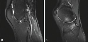 Figure 1: (a) Sagittal magnetic resonance imaging (MRI) showing Patient 1’s anterior cruciate ligament tear. (b) Sagittal MRI showing Patient 1’s resultant bone bruise.