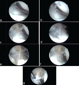 Figure 2: (a-g) Patient 1’s anterolateral meniscofemoral ligament viewed through an anteromedial arthroscopic porthole.