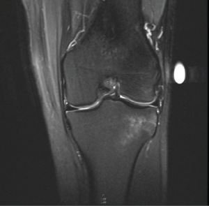 Figure 3: Coronal magnetic resonance imaging showing Patient 1’s anterior horn of the lateral meniscus extending into the anterior cruciate ligament footprint.