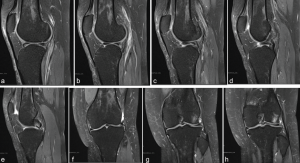 Figure 4: (a-e) Series of sagittal magnetic resonance imagings (MRIs) of Patient 2 displaying a sequence from lateral to medial. The anterolateral meniscofemoral ligaments can be seen continuing from the anterior horn on the lateral meniscus and inserting into the anterior cruciate ligament footprint. This was interpreted as a flipped bucket handle tear prior to surgery. (f-h) Series of coronal MRIs of Patient 2 displaying meniscal tissue within the intercondylar notch. On re-review, the anterolateral meniscofemoral ligament can be seen inserting into the lateral aspect of the intercondylar notch.
