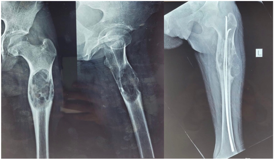Figure 1: Pre-operative Radiograph showing a multicasting lesion in the left proximal femur, Radiograph of post-curettage with fibula grafting with nailing.