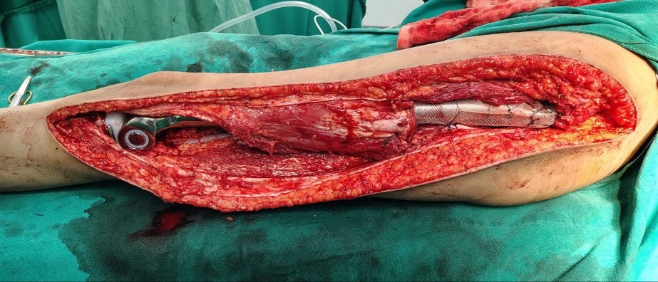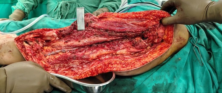 The patient came to us for a second opinion, where we reevaluated from the beginning, with an incisional biopsy done from the wound. It came out to be Osteosarcoma. MRI left lower limb was done to see the local extent. Positron emission tomography (PET) scan was done to rule out distant metastasis. Case discussed in multidisciplinary tumor board and decision taken to go ahead with Perioperative Chemotherapy with surgery. As planned patient given two cycles of Methotrexate, Adriamycin, Cisplatin over 10 weeks. As decided in the multidisciplinary tumor board surgery was planned for her. Due to intramedullary nailing whole femur medullary cavity was contaminated and it was not possible to save distal femur. Surgery planned was a wide excision tumor with left total femur excision with total femur replacement with modular prosthesis reconstruction. Customized prosthesis was made measuring length of the femur shaft and diameter of the femur head. A lateral longitudinal incision was planned to include previous surgery scars. Started caudally with isolating the popliteal artery, popliteal vein, and tibial and common peroneal nerve at the popliteal fossa, proximally, all were traced till their exit from Hunter’s canal. Proximally vastus lateralis was partially sacrificed as the scar of previous surgery was passing through it. The caudal insertion of the gluteus maximum was detached from the femur shaft. Sciatic nerve preserved as shown in Fig. 2. Medially all muscles detached from femur. Disarticulation of knee joint done first followed by hip disarticulation. Specimen delivered with intact scars with it as seen in Fig. 3.