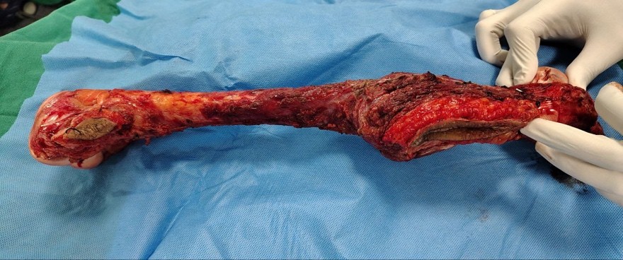 Figure 3: Resected specimen of total femur with excision of previous surgery scars.