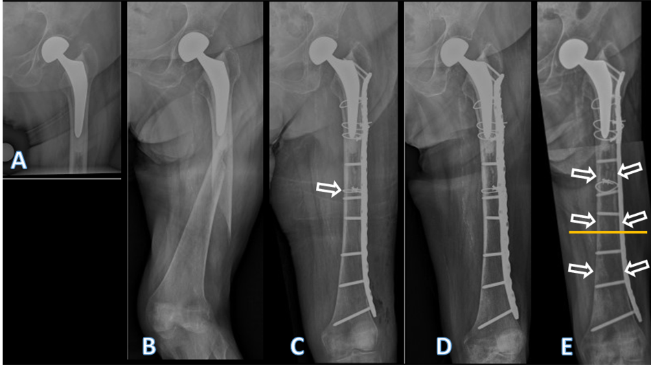 Periprosthetic fractures (PPF) of the proximal femur are one of the most frequent causes of revision after total hip arthroplasty as well as after hip hemiarthroplasty (HHA) [1,2,3]. Revision of the stem is not always necessary in case of PPF, even if the fracture affects the area of anchorage of the implant. Internal fixation with cerclages and plate may be an adequate treatment option if the prosthetic stem is stable, or if a stable construct may be obtained with fixation [2,4,5,6,7,8,9,10]. Preservation of bone perfusion and adequate stability are essential for bone healing and thus the success of internal fixation [11]. One of the main issues with internal fixation using plates is the potential compromise of bone perfusion by compression of the periosteal blood flow due to contact of the implant [12,13,14,15]. Despite increasing experience and further development of internal fixation techniques for many decades, classical problems associated with plate fixation may still happen nowadays. The observations reported provide exceptional insights into both the issues of necrosis and atrophy of the cortical bone following plate fixation of a PPF of the femur. Identification of these complications led to further investigations of the mechanical properties of plates commonly used in this indication. The design and mechanical characteristics of the plate used probably contributed to both complications. Even if limited to a single case, this report may provide important insights to improve internal fixation, beyond the issues of PPF of the proximal femur.