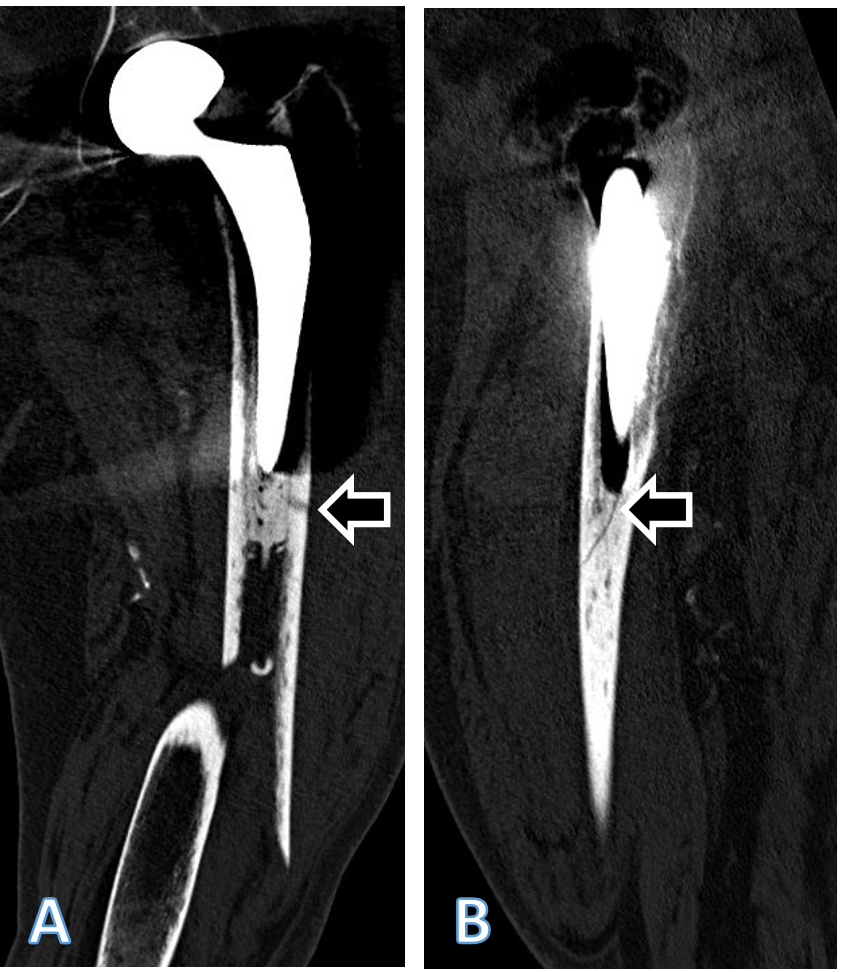 Figure 2: Coronal (a) and sagittal (b) computed tomography (CT) scan reconstructions of the left femur of the patient described, showing the periprosthetic fracture. The extension of the fracture into the lateral cortex at the level of the tip of the stem arrow in (a) as well as a fracture of the cement distally to the tip of the stem arrow in (b) are visible. Both fracture extensions had been missed by the treating team. Accordingly, and considering the line-to-line principle of cementation of the affected stem, the fracture should be classified at least as Unified Classification System Type B2, if not B3, and not as a type C. The sublux-ated appearance of the head of the femoral head prosthesis is an artifact due to movement of the patient during the CT examination.