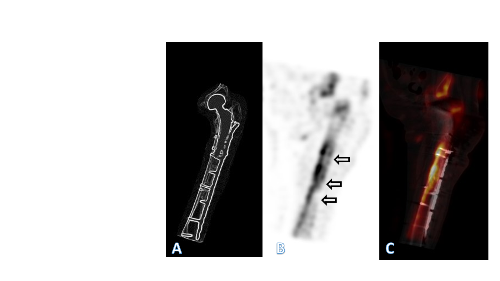 Figure 3: In (a) overview image for orientation. In (b) paracoronal view of the single-photon emission computed tomography (SPECT) of the left femur 4 years after plate fixation of a periprosthetic fracture of the proximal femur after cemented hemiarthroplasty of the hip. In (c) paracoronal reconstruction of the SPECT/computed tomography fusion image of the left femur, also illustrating the implant. The bone directly under the plate showed no detectable metabolic activity in various areas, a typical image of bone necrosis (arrows). In the area of the medial cortex, however, there was compensatory increased activity, which is to be ex-plained by the atrophy of the bone.
