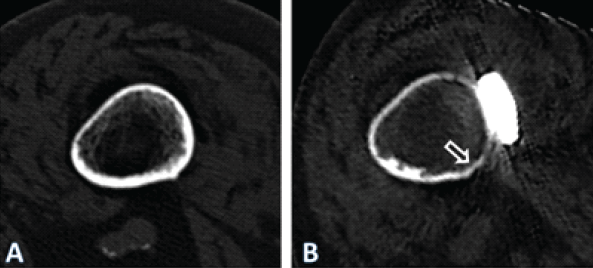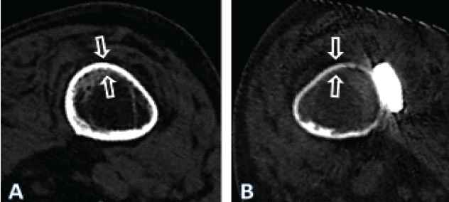 Figure 4: Axial computed tomography (CT)-scan images illustrating the cross-section of the femoral diaphysis of the patient described, at the level of the yellow line in Fig. 1. In (a) at the time of the periprosthetic fracture. In (b) 4 years after internal fixation with a lateral plate. Note general atrophy with thinning out of the cortex. In the area under the plate (ar-row), there were areas of necrosis, with no detectable bone metabolism in a single-photon emission CT. The quality of the image in (b) is reduced due to artifacts caused by the im-plants and due to the movement of the patient during the procedure. Only the geometry of the bone may be compared. The apparent density of the bone is affected by differing acqui-sition protocols as well as due to artifacts induced by the implants, limiting comparison of the density