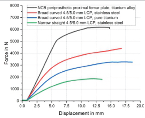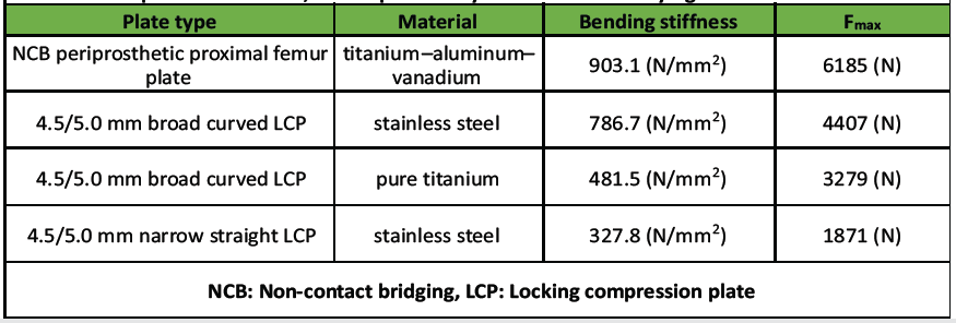 Table 1: Results of the 4-point bending test according to ASTM F382-17 of the 4 plates tested. The NCB plate was tested at the approximate level of the tip of the stem of the total hip replacement in the patient described, as this plate is asymmet-ric with a varying cross-section