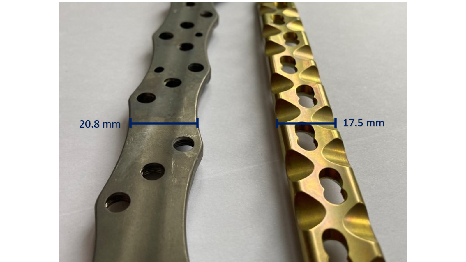 Figure 7: Undersurface of the non-contact bridging (NCB) periprosthetic proximal femur plate (Zimmer Biomet, Zug, Switzerland) on the left and of a broad curved 4.5/5.0 mm locking compression plate (LCP) (DePuy Synthes, Oberdorf, Switzerland) on the right. Note that the NCB has no undercuts and has a longitudinal groove, increasing contact with the tubular diaphyseal bone, whereas the LCP has several undercuts to reduce contact of the plate with the underlying bone.