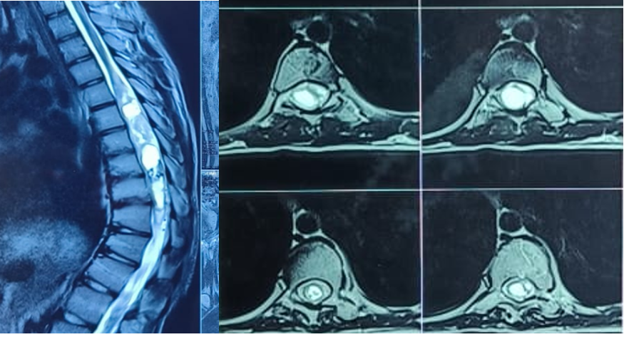 Conclusion: Ganglioglioma is a rare intramedullary tumor of spinal cord typically affecting pediatric age group which can be associated with spine deformity. The treatment of choice for Intraspinal gangliogliomas is complete surgical resection. The aim of surgery is to strike a balance between the extent of tumor resection and preserving the normal spinal cord function without causing iatrogenic neurological deficits.