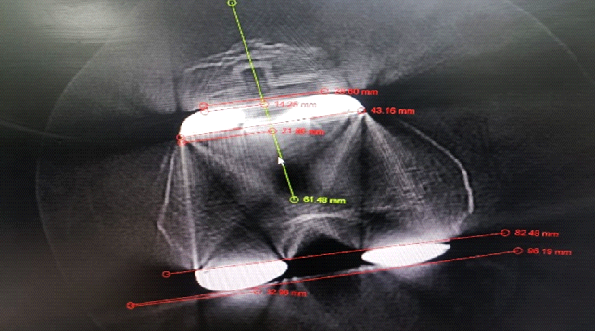 Figure 3: Post-operative computed tomography knee of a patient who received internal rotation in femoral component internally to 2° with reference to surgical epicondylar axis and equivalent valgus rotation of the tibia component.