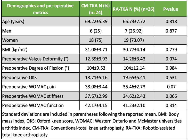 Table 1: Comparison of demographic and pre-operative metrics between CM-TKA and RA-TKA cohorts