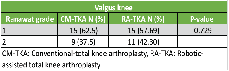 Table 2: Distribution of grade of valgus deformity in CM-TKA and RA-TKA cohorts