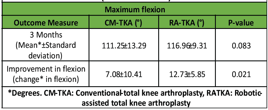 Table 3: Pre-operative and post-operative range of motion (maximum flexion)